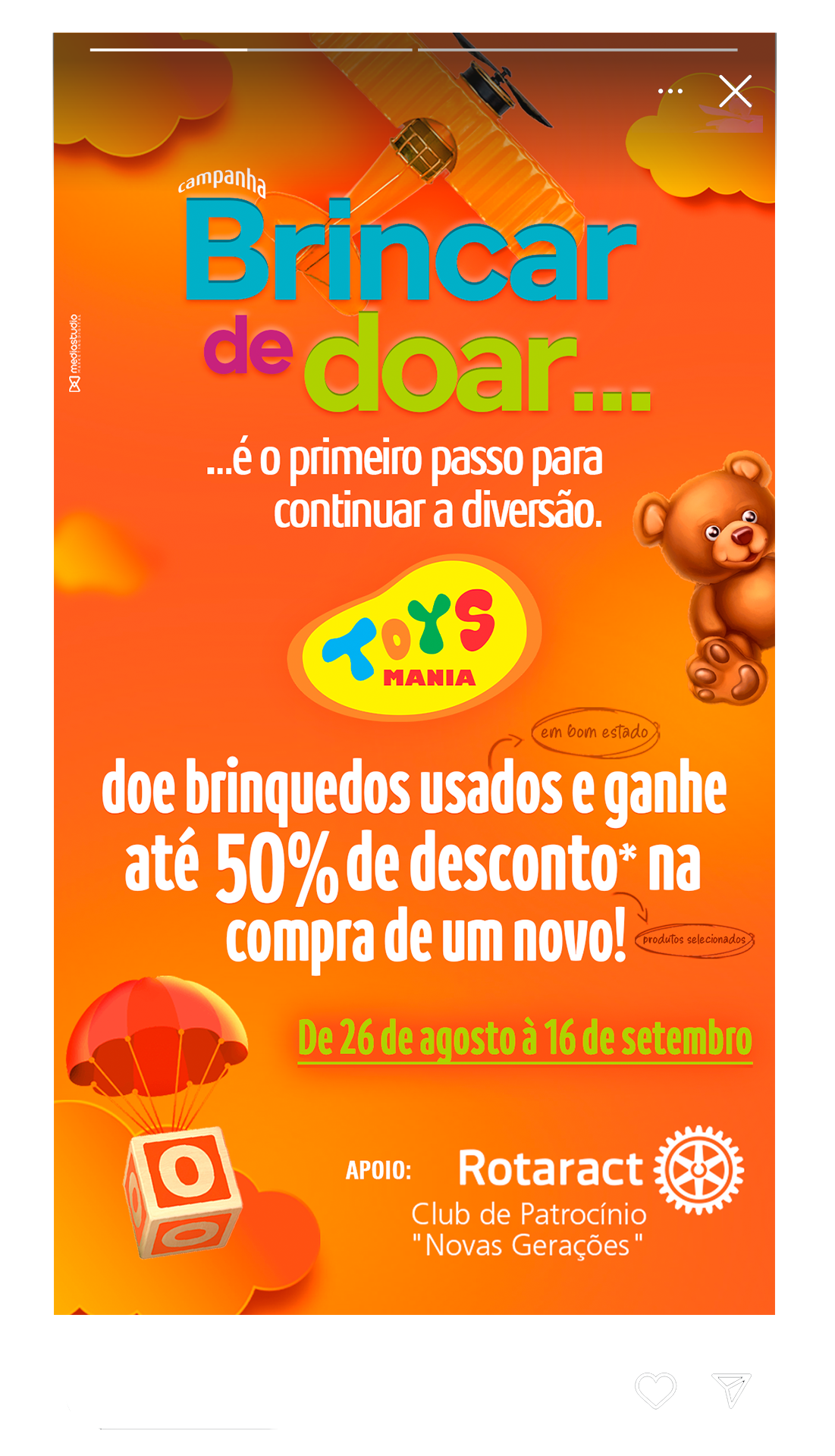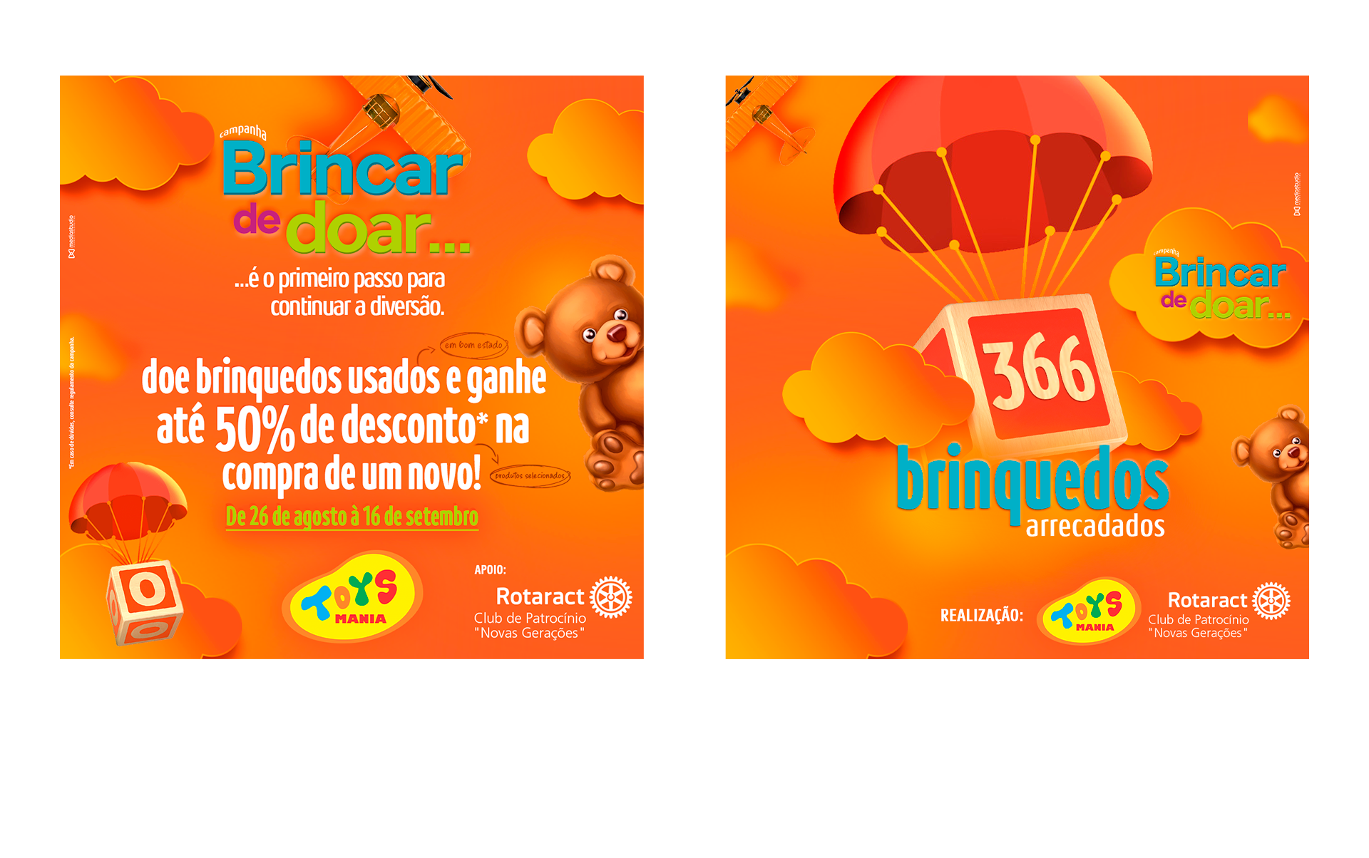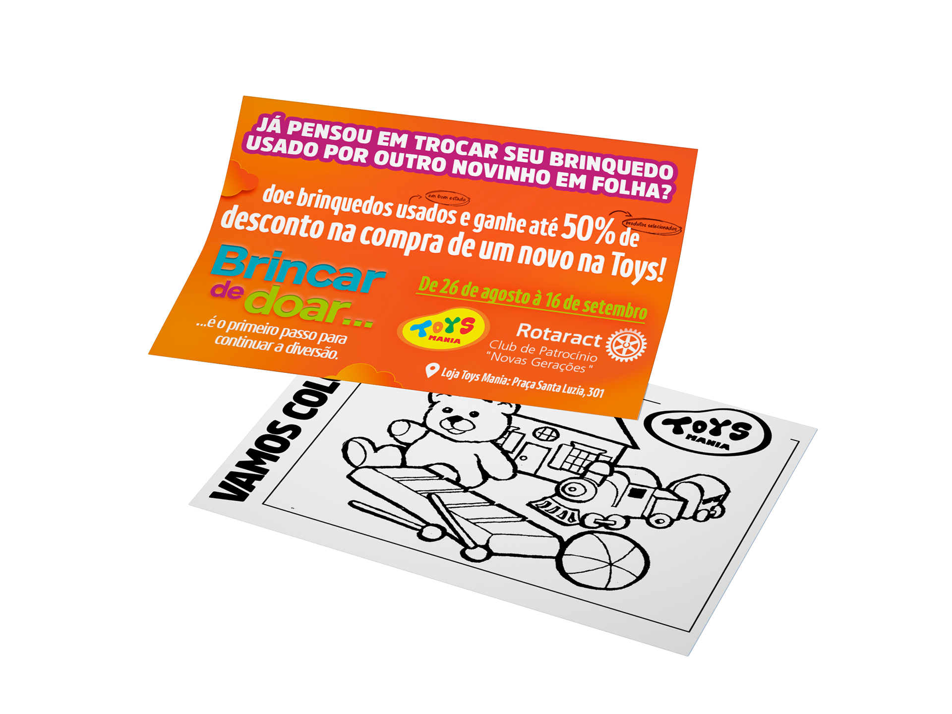 A campanha "Brincar de Doar", desenvolvida para a Toys Mania em parceria com o Rotaract Club de Patrocínio - Novas Gerações, promoveu a solidariedade ao unir o ato de brincar com o gesto de doar brinquedos. Com uma identidade visual lúdica e convidativa, a ação contou com materiais gráficos e desdobramentos em PDV e mídias digitais, engajando a comunidade em prol da causa. Esta foi uma campanha de grande sucesso, que culminou na arrecadação de mais de 360 brinquedos, que foram doados para crianças carentes de instituições da região.