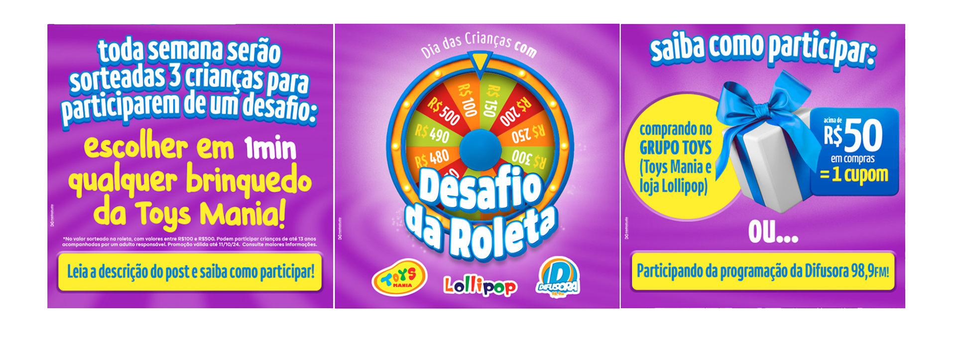 A campanha "Desafio da Roleta", desenvolvida para a Toys Team, trouxe uma abordagem interativa e divertida para envolver o público. Com um design vibrante e elementos lúdicos, a ação incluiu materiais promocionais para mídias digitais e pontos de venda (PDV), além de peças gráficas personalizadas para destacar a dinâmica do desafio. A campanha foi pensada para atrair crianças e famílias, proporcionando momentos de diversão e interação.