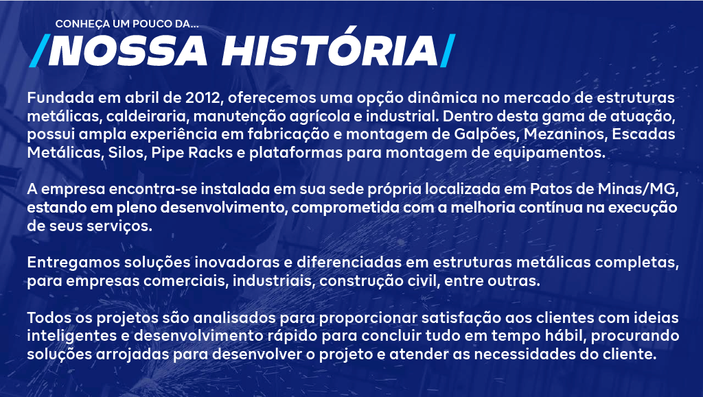 Portfólio desenvolvido para a Vieira Engenharia, situada em Patos de Minas/MG, apresentando a empresa como referência em estruturas metálicas, caldeiraria e manutenção agrícola e industrial, atuante desde 2012. Especializada em projetos civis, atualizações e mecânicas, fabricação e monta galpões, mezaninos, escadas metálicas, silos, entre outros. Comprometida com soluções inovadoras, destaca economia, agilidade e segurança em suas obras. O portfólio apresenta exemplos de projetos realizados e reforça o foco em qualidade, atendimento ágil e satisfação do cliente.